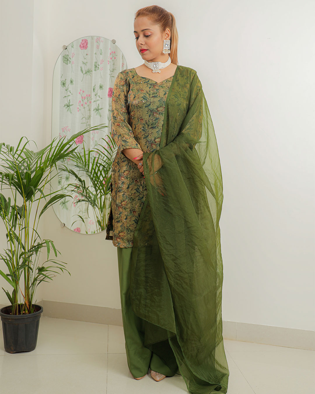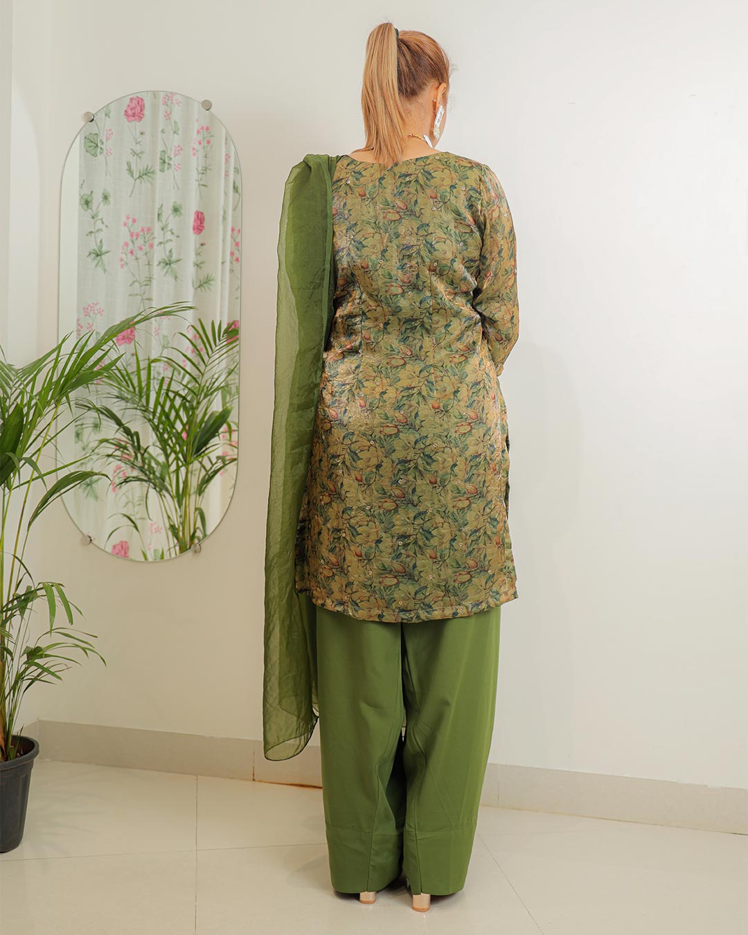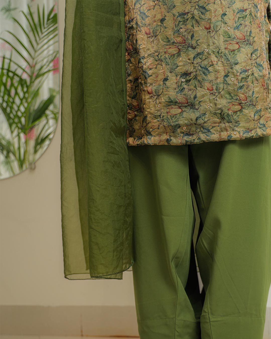 Step into timeless elegance with this shiny printed Jimmy Choo Farsi suit, designed for the modern woman who cherishes tradition. Crafted from luxurious fabric with a rich green floral print, the kurta boasts a graceful silhouette paired with a classic Farsi-style bottom for effortless charm. The soft organza dupatta, lightweight yet striking, adds a touch of ethereal finesse with its sheer texture and fluid drape. Perfect for festive gatherings, formal dinners, or cultural celebrations, this suit balances comfort and couture with its intricate print and flattering design. A versatile statement piece for any wardrobe.