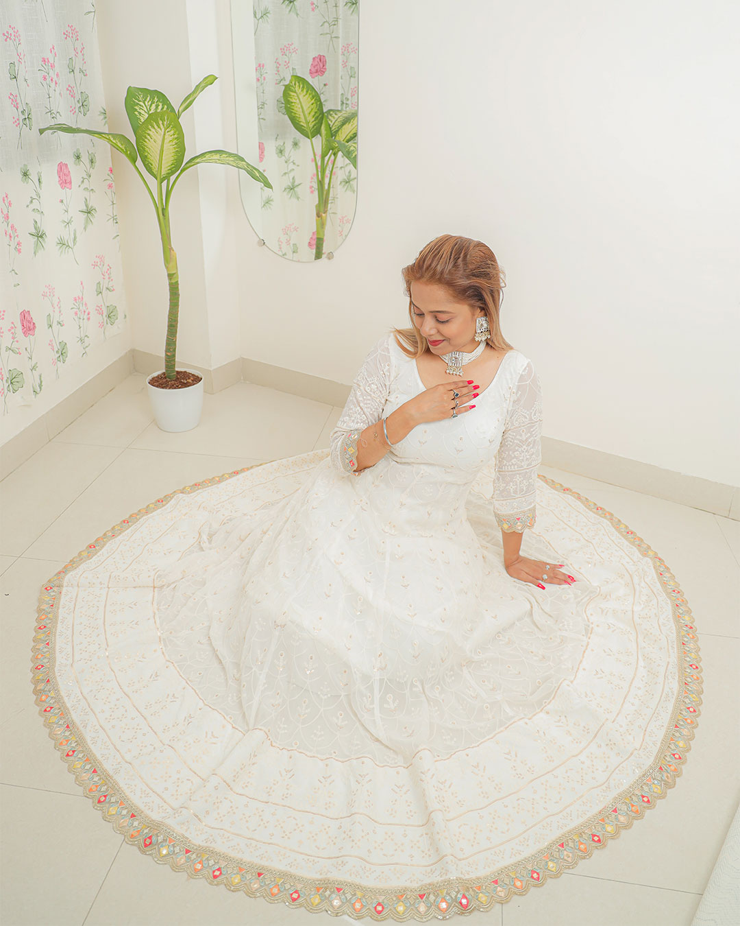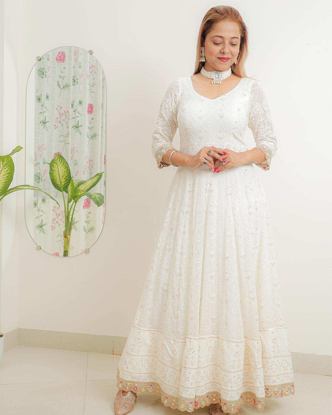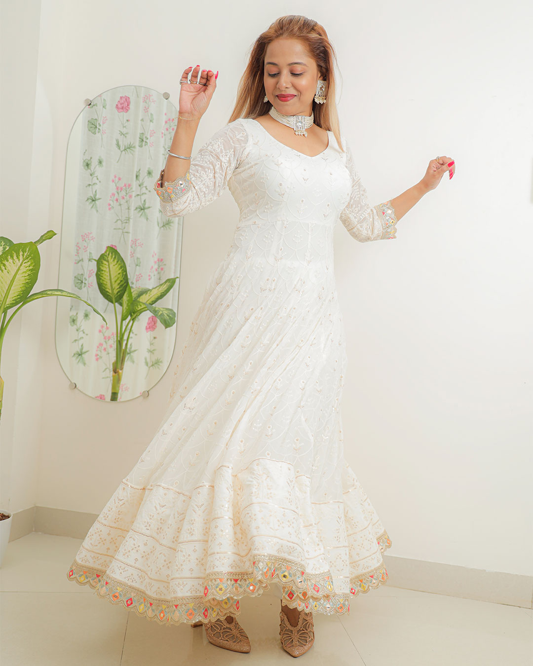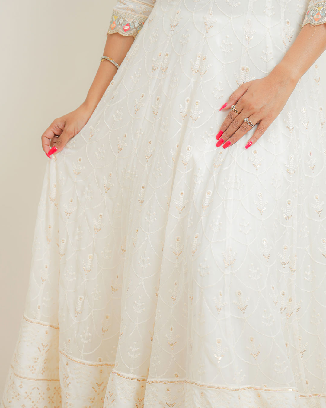 This exquisite off-white georgette Anarkali is the epitome of elegance and tradition, crafted to perfection for any special occasion. The lightweight fabric drapes effortlessly, offering both comfort and grace. The delicate schiffli embroidery on the bodice creates a soft, intricate texture that exudes understated luxury, while the subtle sequin work adds a gentle shimmer, catching the light with every movement.