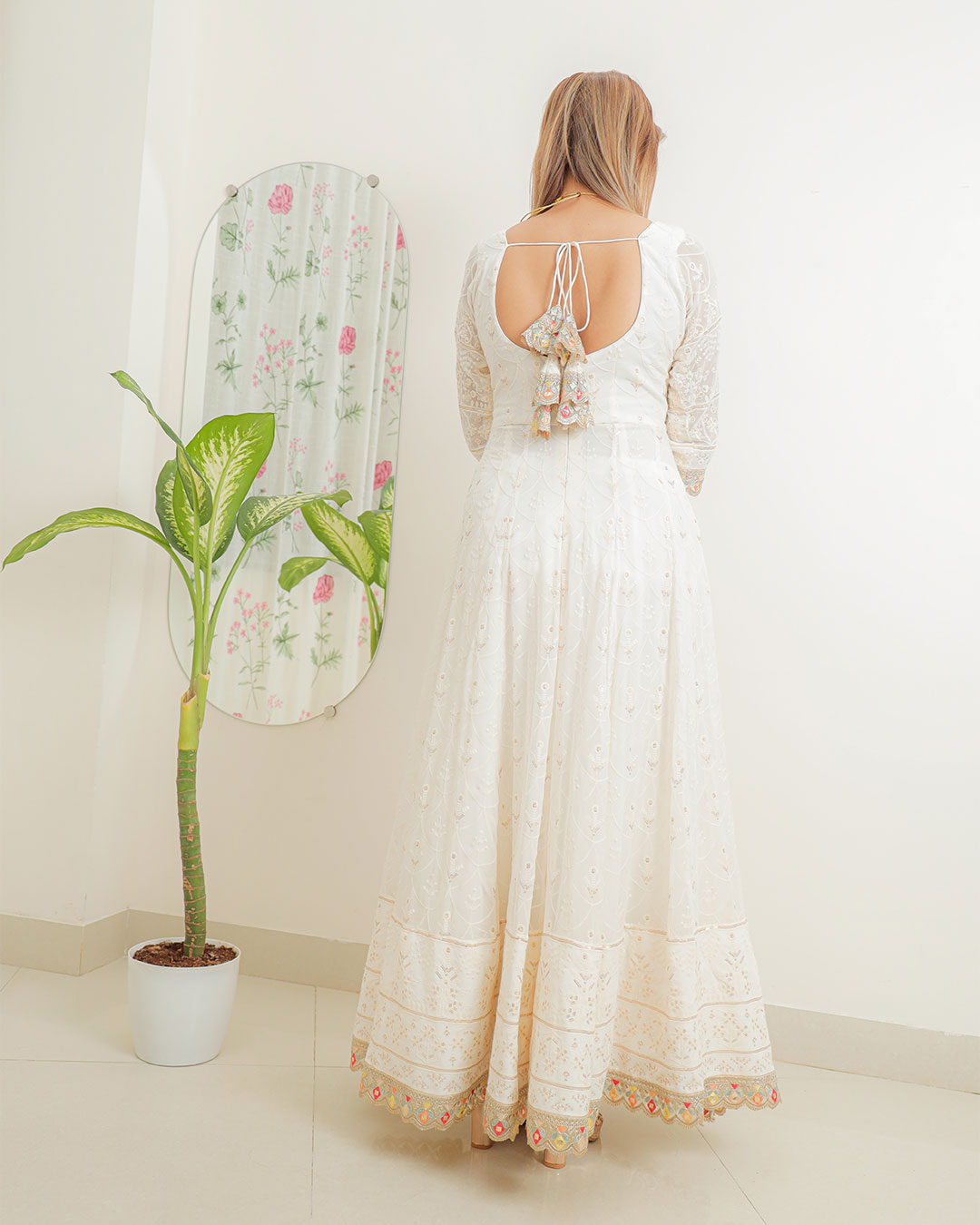 The Anarkali features a flattering sweetheart neck design, which enhances the neckline with a touch of modernity, perfectly balanced by the vintage charm of the deep back neck. The back is accentuated with a traditional dori, tied elegantly with a lace latkan, adding a playful and feminine touch.